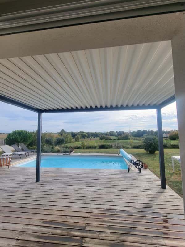 Pergola bioclimatique : équipée de lames orientables motorisées pour gérer lumière et ventilation.